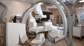 At Greenwich Hospital, stroke patients are treated in a new $4.5 million neuroscience interventional laboratory that features neuro biplane three-dimensional imaging. A neuro interventionist along with specially trained nurses and technicians are on standby 24/7 to respond to a stroke alert. Candidates for mechanical thrombectomy also undergo a brain perfusion scan to assess the size of the stroke and how much brain tissue is at risk of dying. Biplane imaging plays a critical role in the delivery of safe stroke care, explained Dr. Zetchi.
