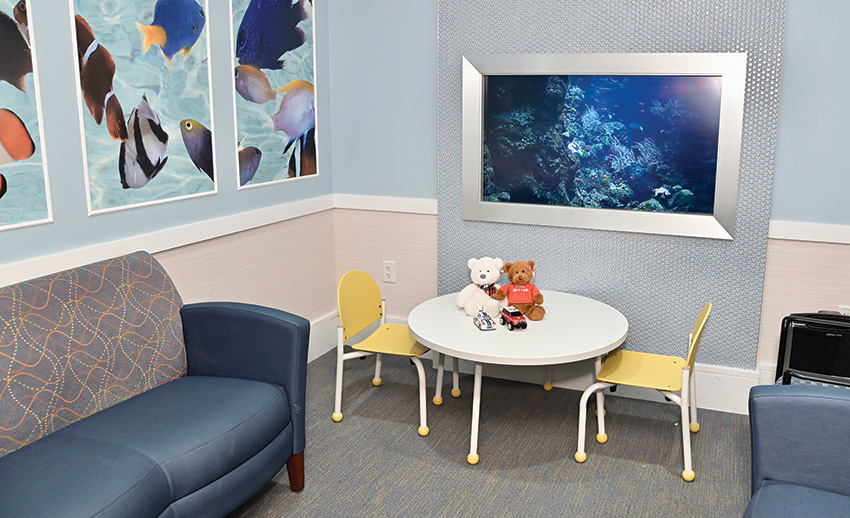 “Our clinical training helps us navigate the nuances and subtleties of caring for children and teens. We work with the family and the child to hone in on exactly what’s going on,” said Seth Woolf, MD, a Yale Medicine pediatric emergency medicine physician. Nearly 25 percent of the roughly 40,000 patients treated in the Emergency Department each year are children and adolescents. A separate pediatric waiting room – featuring a virtual fish tank, child-size furniture, age-appropriate books, TV programming and interactive media – helps to make a child’s visit less stressful. Kid-friendly decor makes the examination rooms more inviting.