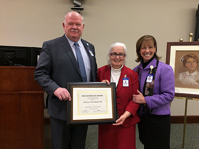 Pat Szechtman, RN, winner of the Helen Meehan Award for Excellence in Nursing, flanked by Susan Brown, RN, chief nursing officer and executive vice president of operations and patient care services and Norman Roth, president of Greenwich Hospital.