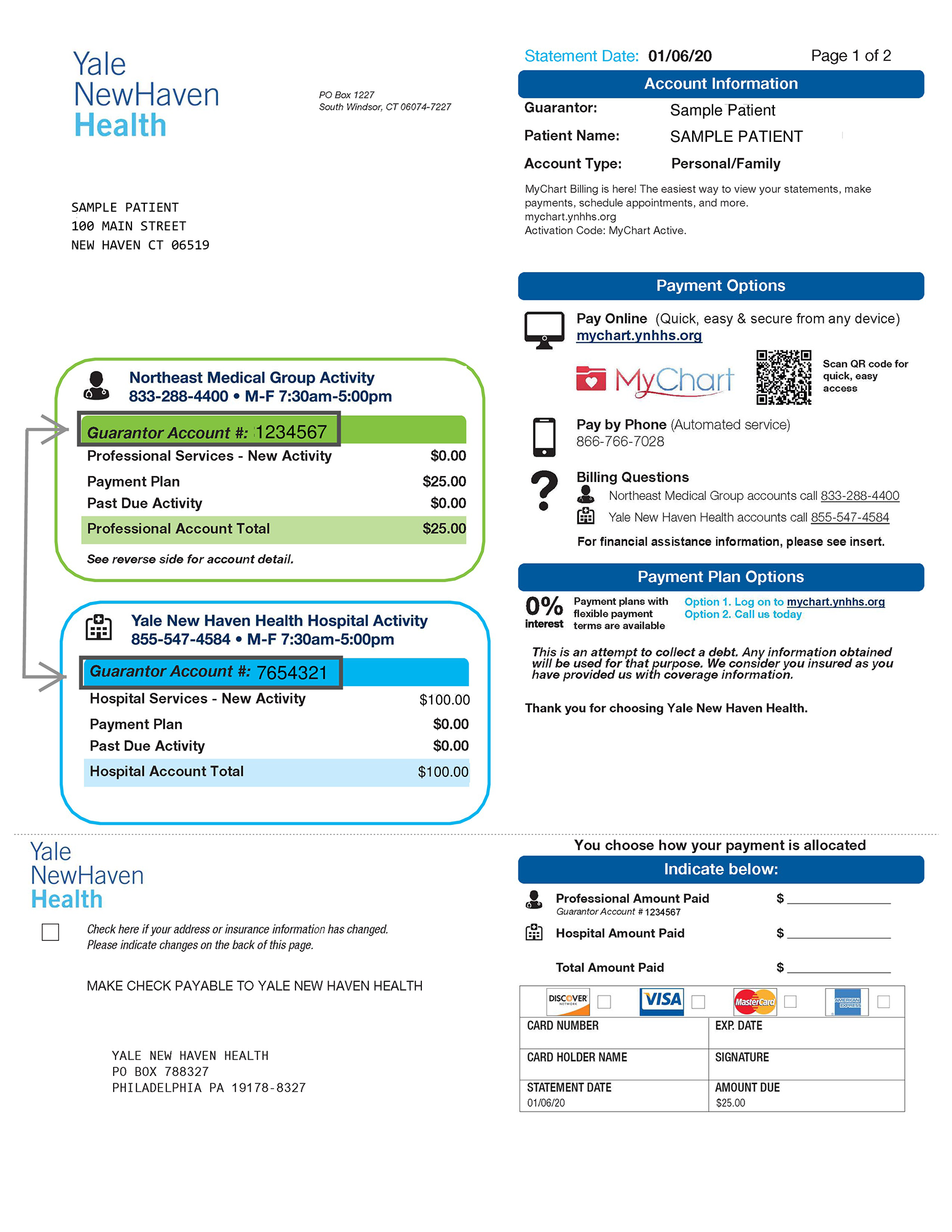 Yale New Haven Health bills show activity and balances due for hospital where a patient liability has been incurred. View a sample billing statement (below) or visit our Resources section for more help.