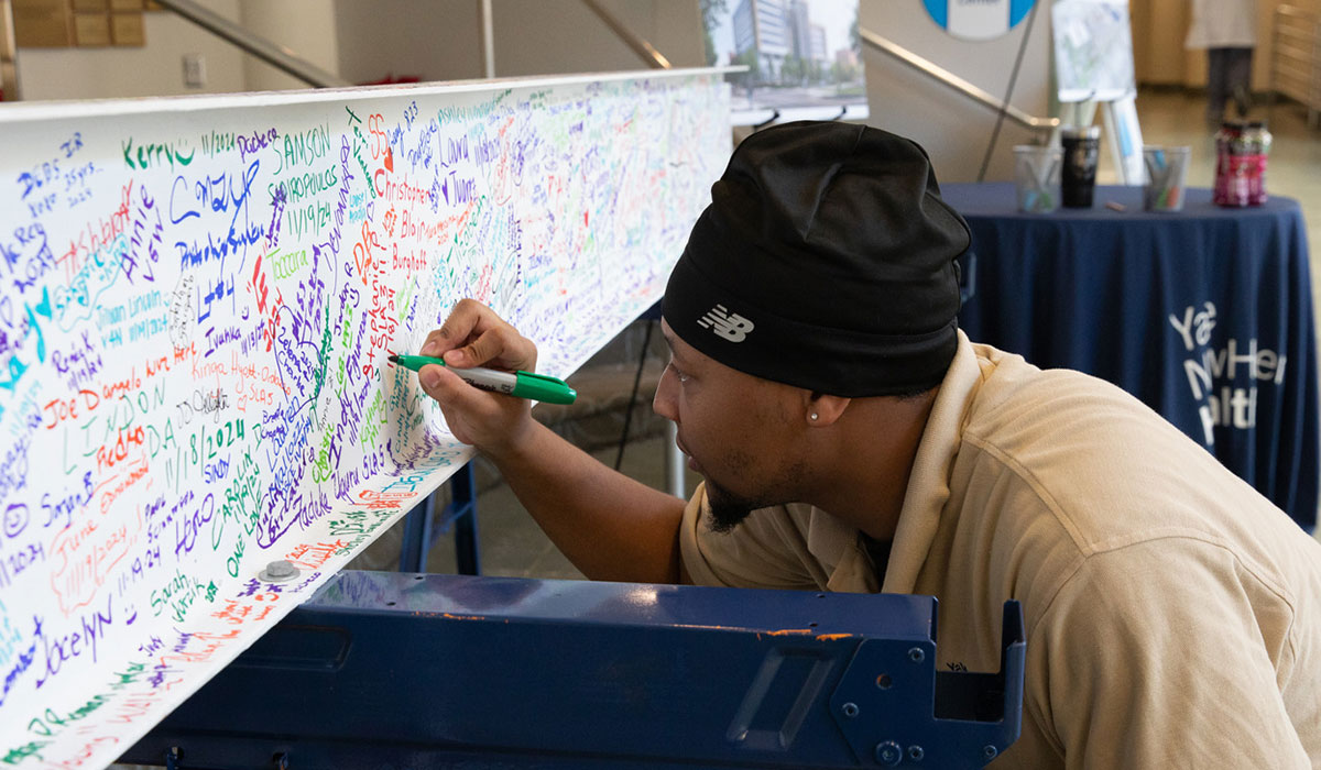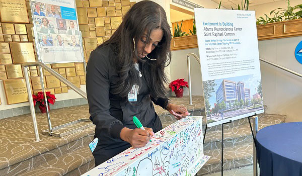 Charlese Carr, unit associate, Perioperative Services, added her name to the Sherman Tower beam at the SRC.