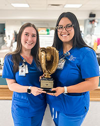 Emily Cardinale, RN, (left) and Andrea Galeano, RN, Medical Intensive Care Unit (MICU) were recognized for interventions with an MICU patient scheduled for a CT scan. The patient was placed on a transport ventilator, but was switched back to the bedside ventilator when the test was delayed. A short time later, the patient’s blood pressure dropped to an unsafe level, triggering an alarm. The primary nurse was with another patient, so Cardinale assisted and called for help. Galeano took the patient off the ventilator and began manual oxygenation. The nurses had called the physician assistant and respiratory therapist, when Galeano discovered a ventilator malfunction. It was fixed, and the patient’s blood pressure and oxygen saturation normalized.
