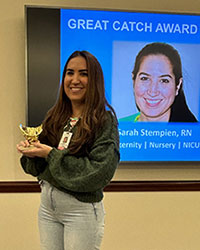 Brianna Leone, RN, Emergency Department, and Anthony Renzoni, PharmD, Pharmacy, were honored for caring for an ED patient who required calcium gluconate for hyperkalemia. Leone noticed the calcium gluconate was ordered as a 60-minute infusion instead of as an IV push over five minutes. She escalated her concerns to Renzoni, who worked with the provider to replace the order and ensure the patient received the correct medication dose. Renzoni investigated further and discovered that an incorrect calcium gluconate order was linked to the Hyperkalemia Pathway in Epic. He worked with the appropriate teams to make a systemwide change to remove the incorrect order from Epic and streamline administration instructions.