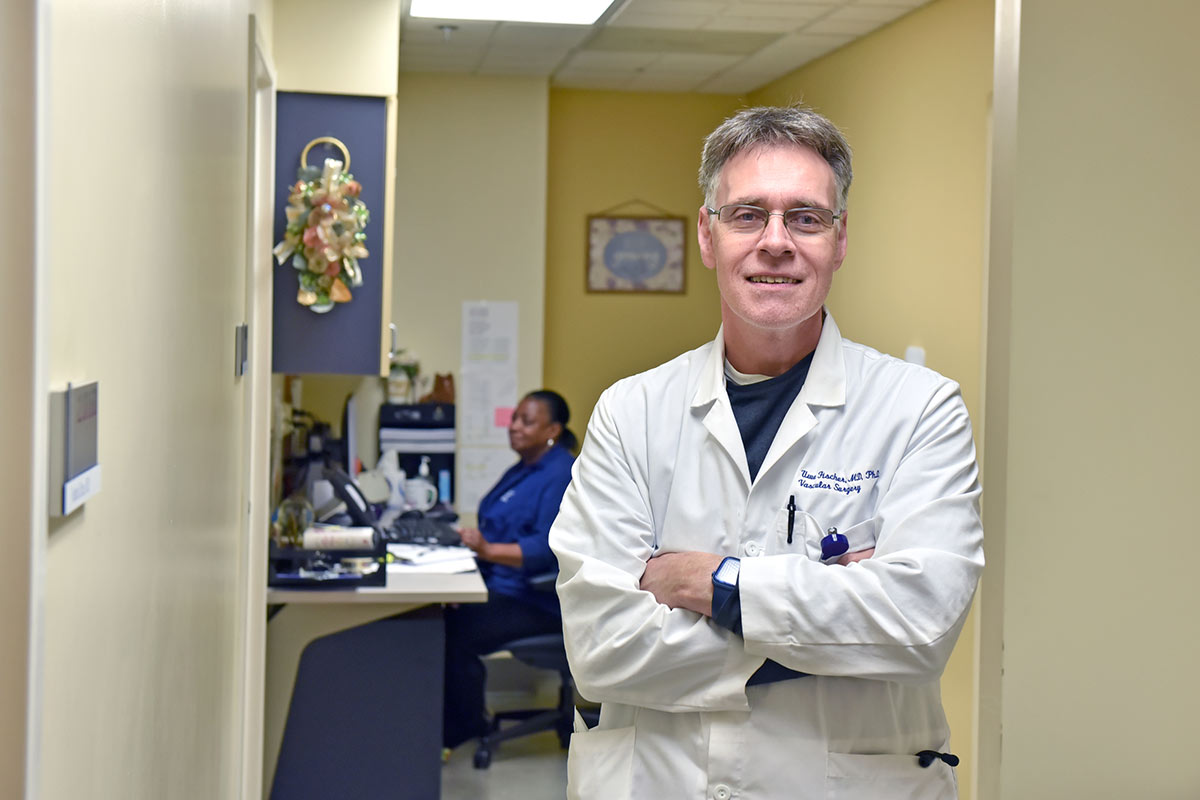 He treats patients for a variety of vascular conditions, including aneurysms, carotid disease, peripheral arterial disease, varicose veins, and lower extremity limb preservation.