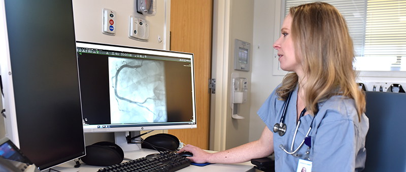 Jennifer Frampton, DO, reviews a patient’s angiograph image to look for signs of coronary artery disease.