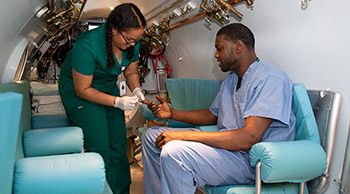 After his skin graft showed signs of rejection, Moncrieffe was referred for hyperbaric oxygen therapy (HBOT). HBOT is a medical treatment in which patients breathe 100 percent pure oxygen inside a pressurized chamber. When pure oxygen is inhaled at an increased pressure, it promotes the healing process of specific chronic wounds, increases the effects of some antibiotics and activates white blood cells to fight certain infections. The hyperbaric oxygen chamber at the Wound Center is the only hospital-based multi-place hyperbaric chamber in the state.