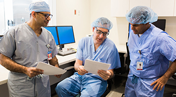 Chief of Cardiothoracic Surgery Umer Darr, MD, of Yale Medicine, interventional cardiologist Edward Tuohy, MD, with Northeast Medical Group’s Cardiac Specialists, and interventional cardiologist Victor Mejia, MD, of Northeast Medical Group’s PriMed Cardiology collaborate on patients’ personalized treatment plans in conjunction with other healthcare professionals on Bridgeport Hospital’s multidisciplinary heart team.
