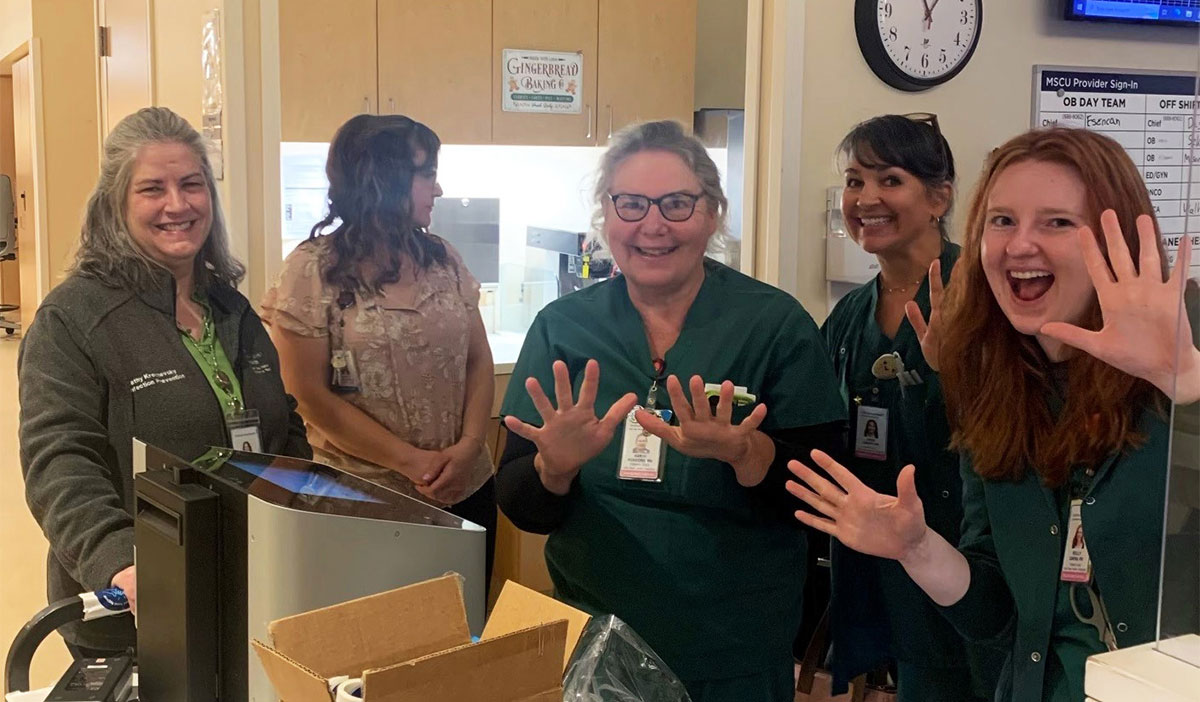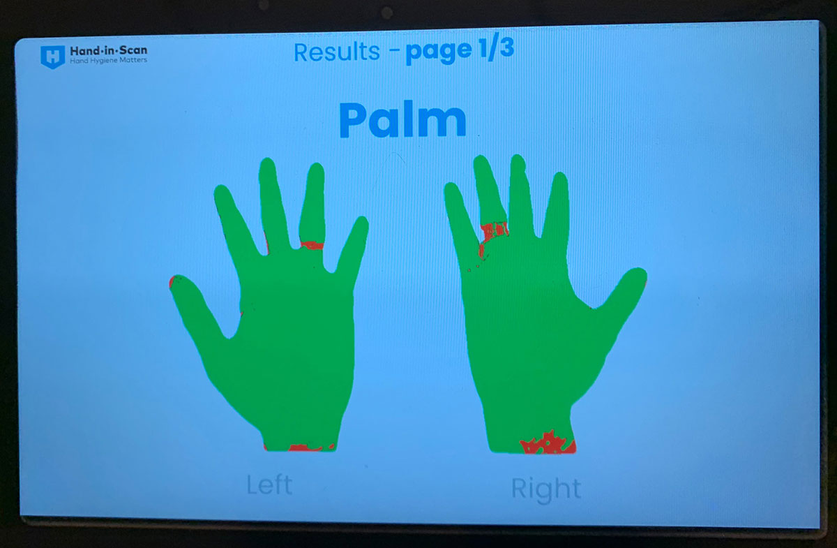 During the recent Hand Hygiene Day, service line leads and infection preventionists visited units with an interactive hand hygiene assessment scanner. The device gives staff a first-hand look at the effectiveness of proper hand hygiene. The machine uses a special training gel which, when applied to the hands, simulates alcohol-based hand sanitizers. The machine generates an image showing areas that were missed during gel application.
