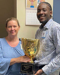 Cheryl Handy and Ivan Foskey, patient relations specialists, were recognized for their questioning attitudes while rounding in the York Street Campus Emergency Department. They saw a person heading into the ED Annex in apparent distress but he had stopped moving. They approached him and asked if he was okay. When the man began to lose consciousness, Foskey caught him and helped him safely to the floor while Handy flagged down a nurse manager to assist. Thanks to their use of CHAMP behaviors, Handy and Foskey prevented a potential fall with injury.