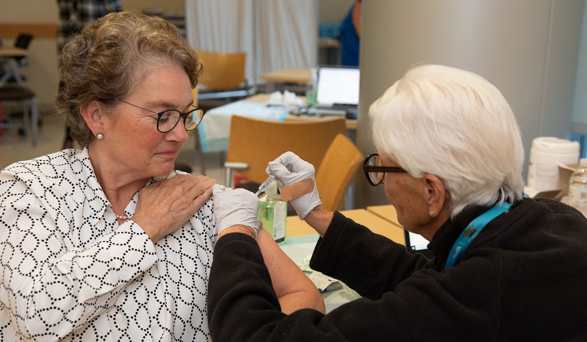 There’s still time, but the clock is ticking. The deadline to comply with YNHHS’ mandatory flu vaccination program is Sunday, Dec. 1, 2024. As a condition of continued employment, employees and physicians must receive a flu vaccination annually or provide an approved medical or religious exemption. This requirement also applies to employees working remotely. Employees at Lawrence + Memorial and Westerly hospitals and staff at the VNA of Southeastern CT must either receive a flu vaccination or complete a declination form. Check the intranet for information about scheduling your flu vaccination and optional COVID booster. And don’t forget to complete the online flu module on the Infor Learning Management System (LMS), which is also due by Dec. 1. Katherine Heilpern, MD, president of Yale New Haven Hospital (left) recently received her flu vaccination from Paulajan Michalowski, RN.